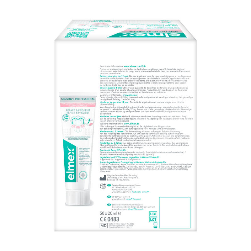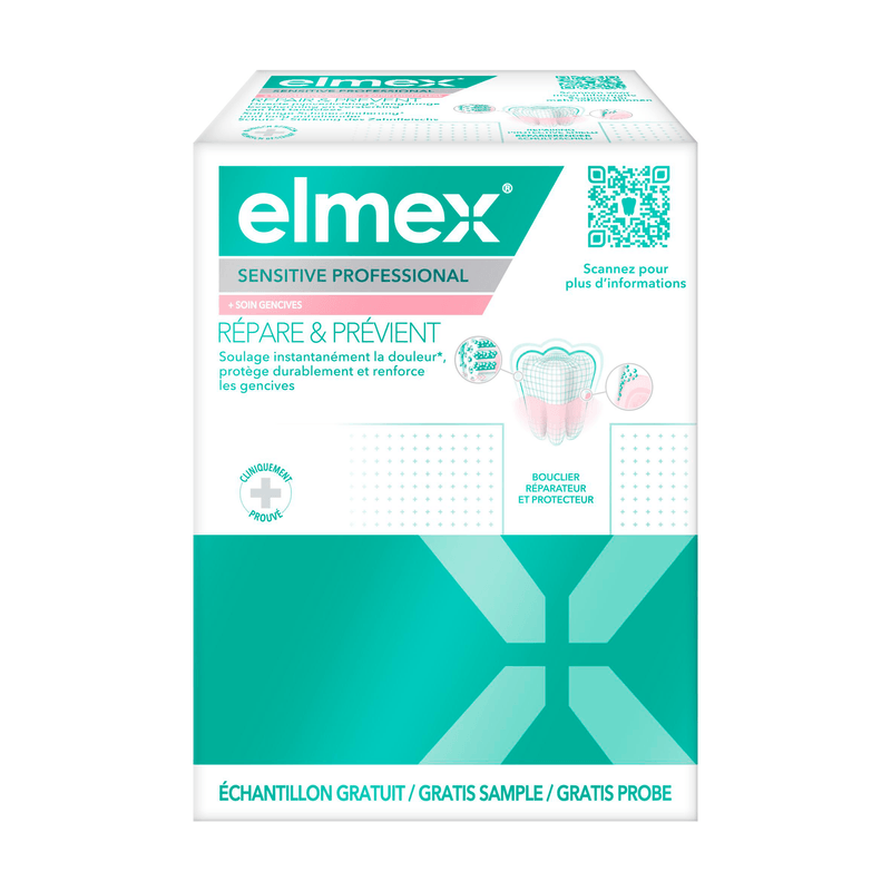 Avec le dentifrice elmex® Sensitive Professional Répart & Prévient, prenez soin des dents sensibles et prévenez la cause de la sensibilité dentaire. Ce dentifrice pour dents sensibles procure un soulagement instantané* en obturant et réparant les petits canalicules menant au nerf dentaire, d'où provient la douleur liée à la sensibilité. En refermant les canalicules, ce dentifrice pour dents sensibles protège contre la douleur liée à la sensibilité et, lorsqu'il est utilisé régulièrement, il crée une barrière protectrice réparatrice** pour une protection durable et un renforcement des gencives. Ce dentifrice pour dents sensibles contient du zinc qui renforce les gencives et aide à prévenir la récession gingivale, qui peut être une cause importante de sensibilité.